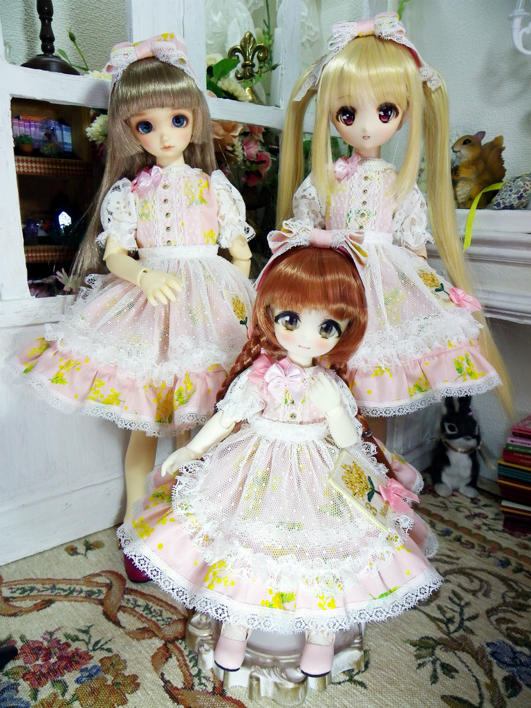 ミモザ柄の生地を使用して姉妹服を製作致しました。
