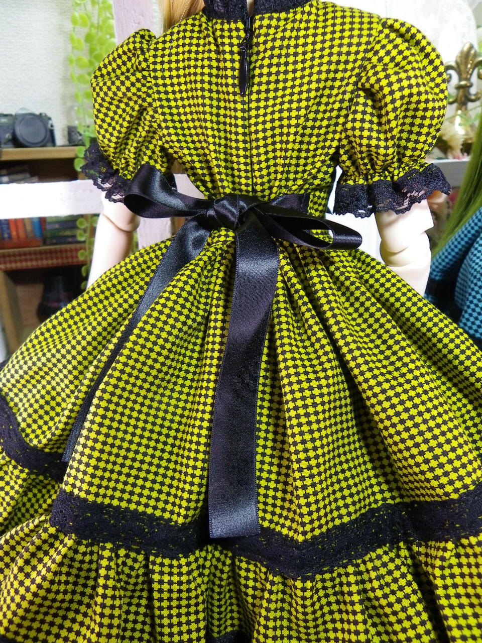 黄緑色と緑のチェック生地を使用してふんわり豪華なワンピースセットに致しました。