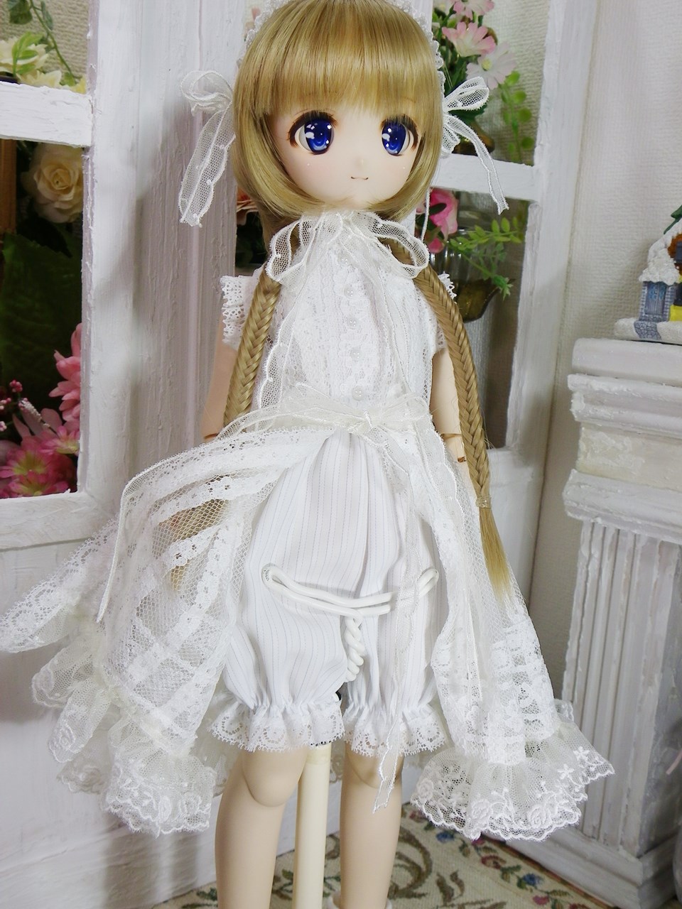 オールインワンは白×青のコードストライプ生地で制作しました。下のパンツはドロワーズみたいな形になっております。(後ろはコンシールファスナーで着脱)
