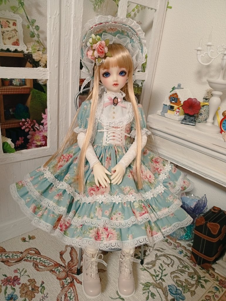 yuwaの水色の生地を使用しカントリー風なお洋服を制作致しました。