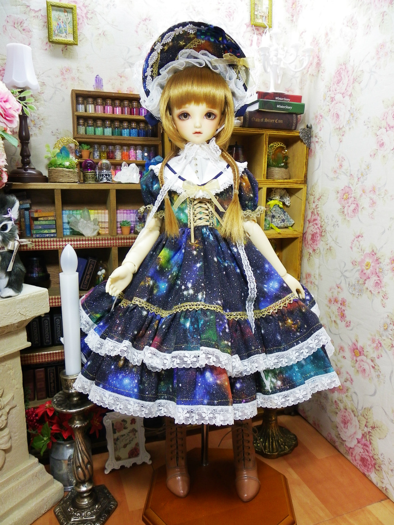 USコットンの宇宙柄生地を使用してセーラー襟付きのワンピースを製作致しました。