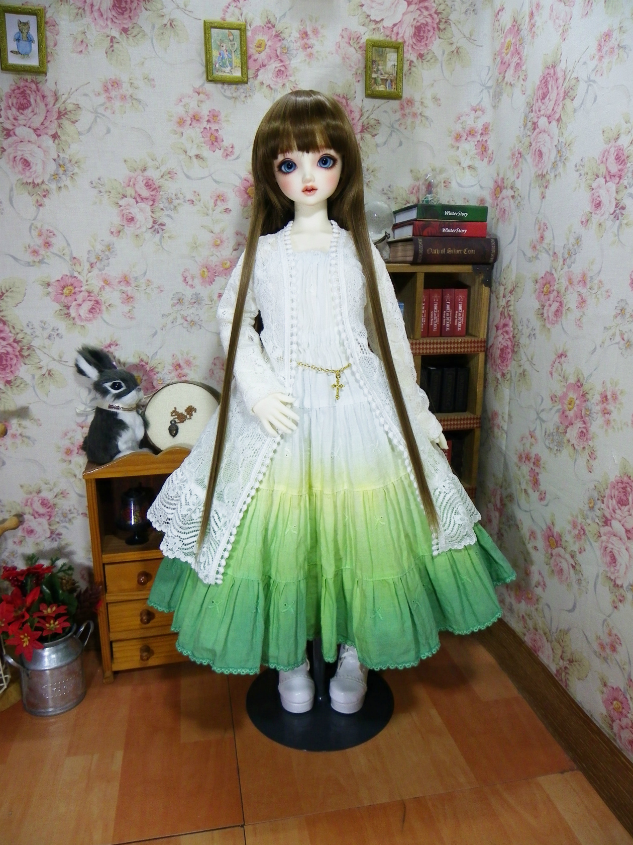 ワンピースはふんわりに広がりますので座らせると綺麗に全円広がります。